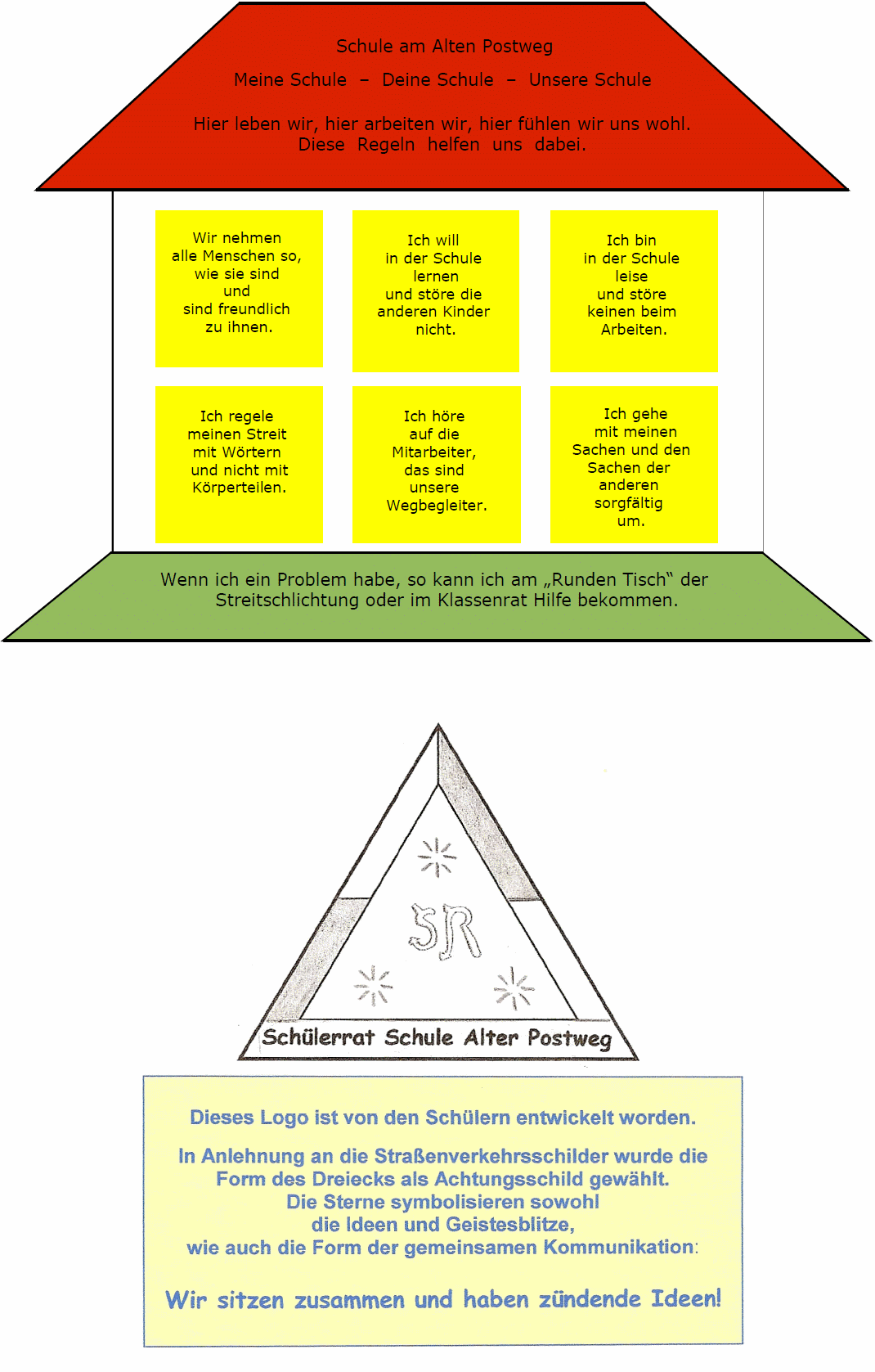 Die Regelhaus mit den Schulregeln und das Logo des Schülerrates der Schule am Alten Postweg